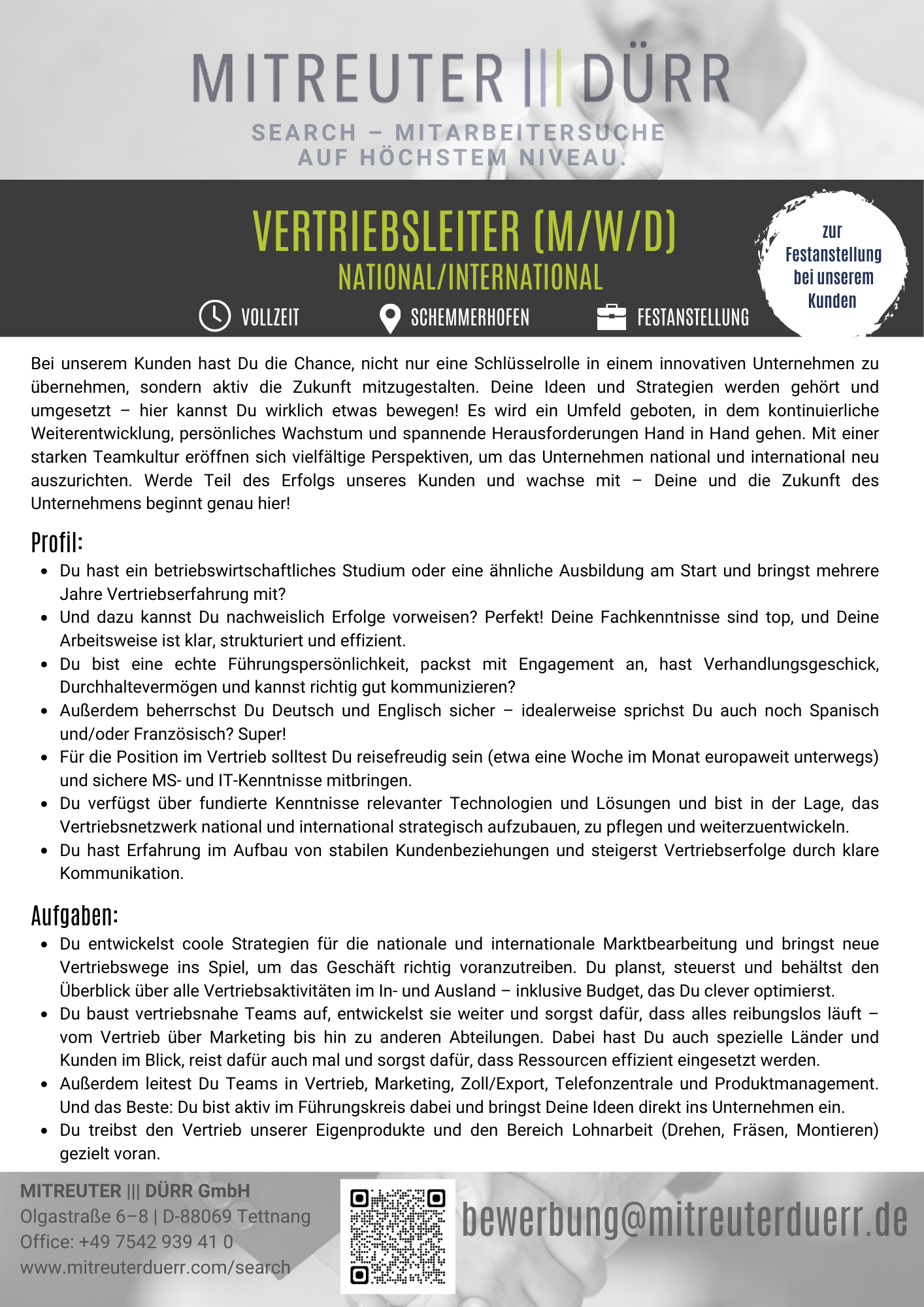 Bei unserem Kunden hast du die Chance, nicht nur eine Schlüsselrolle in einem innovativen Unternehmen zu übernehmen, sondern aktiv die Zukunft mitzugestalten. Deine Ideen und Strategien werden gehört und umgesetzt – hier kannst du wirklich etwas bewegen! Es wird ein Umfeld geboten, in dem kontinuierliche Weiterentwicklung, persönliches Wachstum und spannende Herausforderungen Hand in Hand gehen. Mit einer starken Teamkultur eröffnen sich vielfältige Perspektiven, um das Unternehmen national und international neu auszurichten. Werde Teil des Erfolgs unseres Kunden und wachse mit – Deine und die Zukunft des Unternehmens beginnt genau hier!